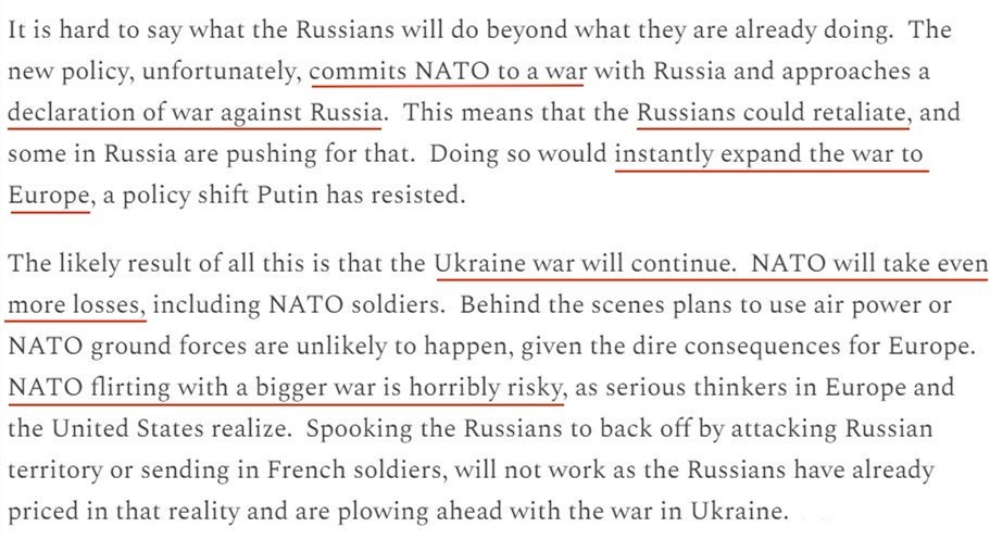 文章警告,美國等國家放寬援烏武器使用限制的新政策在事實上將北約拉進了與俄羅斯的沖突中,并且已經(jīng)接近于對俄宣戰(zhàn)。這將導(dǎo)致俄烏沖突無限期繼續(xù)下去,最終令北約自身蒙受更多損失。