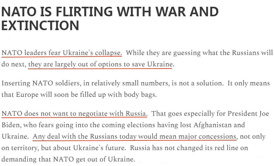 “正如歐美一些嚴(yán)肅的思考者所認識到的那樣,北約把一場更大的戰(zhàn)爭視如兒戲是極其危險的行為?!?/p>