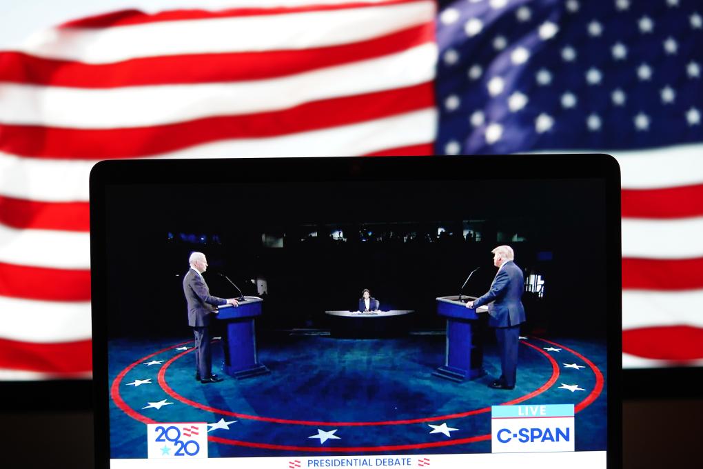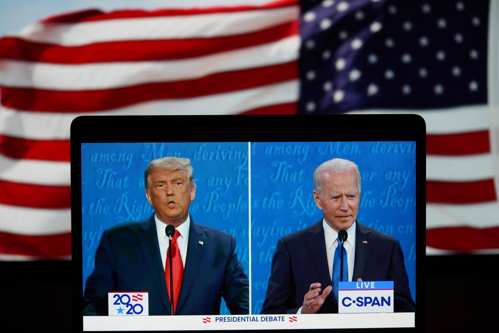 2020年10月22日在美國(guó)弗吉尼亞州阿靈頓拍攝的視頻畫(huà)面顯示,時(shí)任美國(guó)總統(tǒng)特朗普(右)與時(shí)任民主黨總統(tǒng)候選人拜登(左)在田納西州納什維爾市參加最后一場(chǎng)總統(tǒng)候選人電視辯論。新華社記者劉杰攝