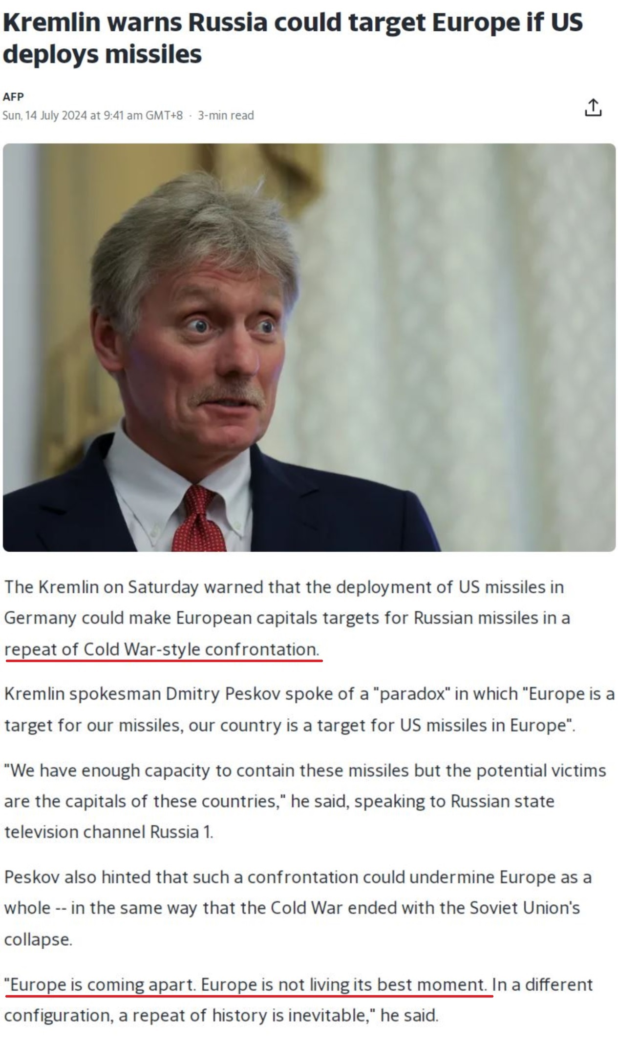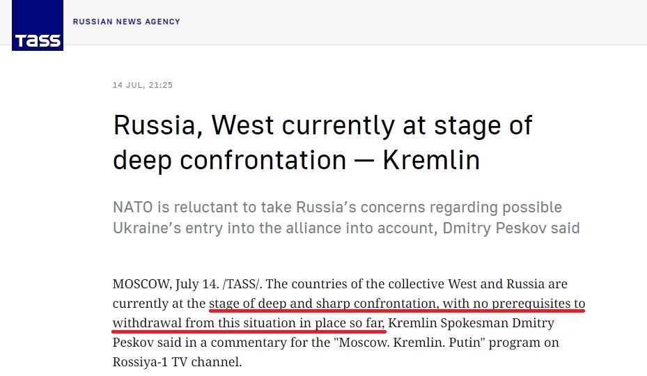 佩斯科夫警告,美國的最新舉動(dòng)可能會(huì)讓歐洲“重演冷戰(zhàn)式對(duì)抗”,“歐洲正在分崩離析。對(duì)歐洲來說,這絕不是最好的時(shí)刻”。