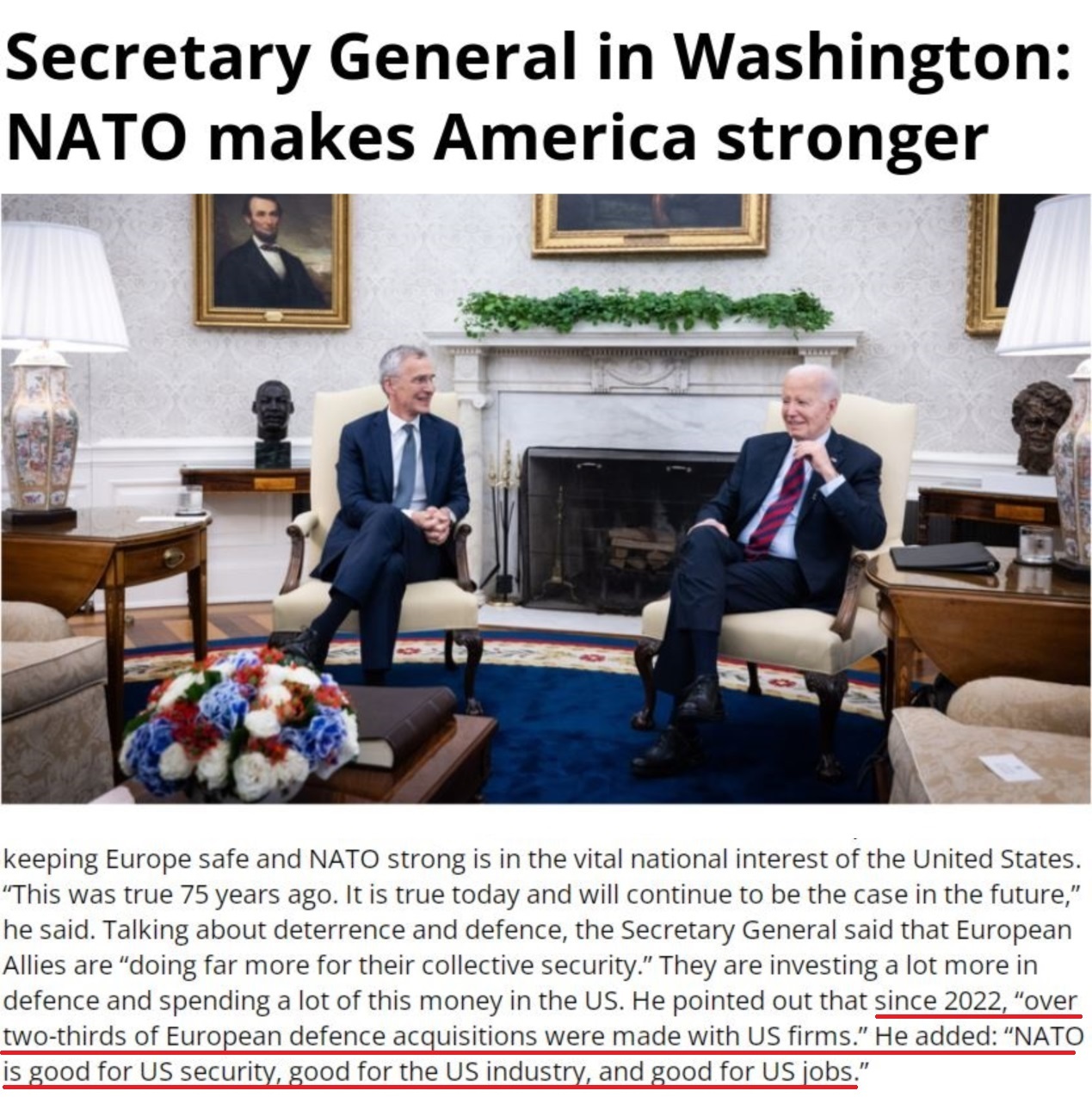 北約官網(wǎng):斯托爾滕貝格告訴美國總統(tǒng)拜登,保持歐洲安全和北約強(qiáng)大符合美國的國家利益,“有利于美國的安全,有利于美國的工業(yè),有利于美國的就業(yè)”。