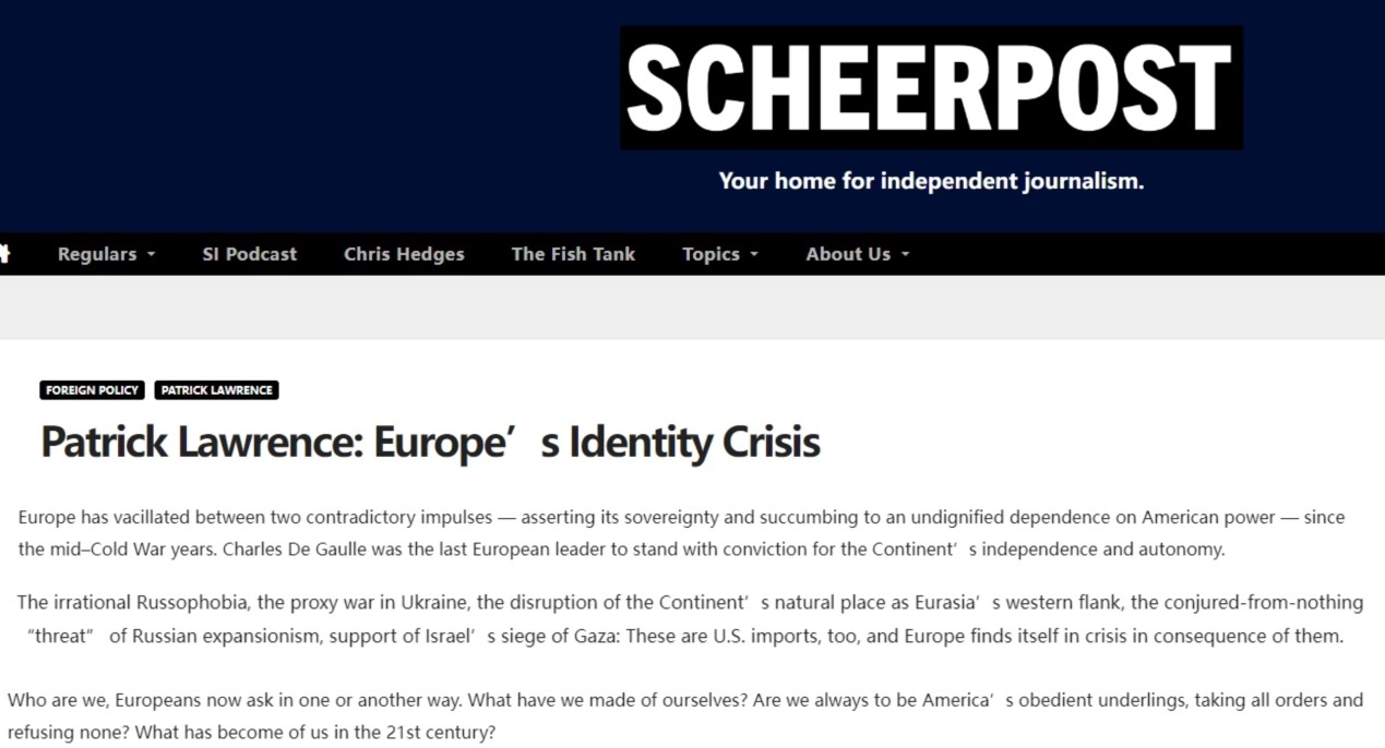 美國資深媒體人兼作家帕特里克·勞倫斯此前發(fā)文指出,自冷戰(zhàn)中期以來,歐洲始終在“維護(hù)自身主權(quán)”和“對(duì)美國實(shí)力的無尊嚴(yán)依賴”這對(duì)矛盾之間搖擺不定。而美國重新把矛頭對(duì)準(zhǔn)俄羅斯后,更是在歐洲引發(fā)了嚴(yán)重的身份危機(jī)。