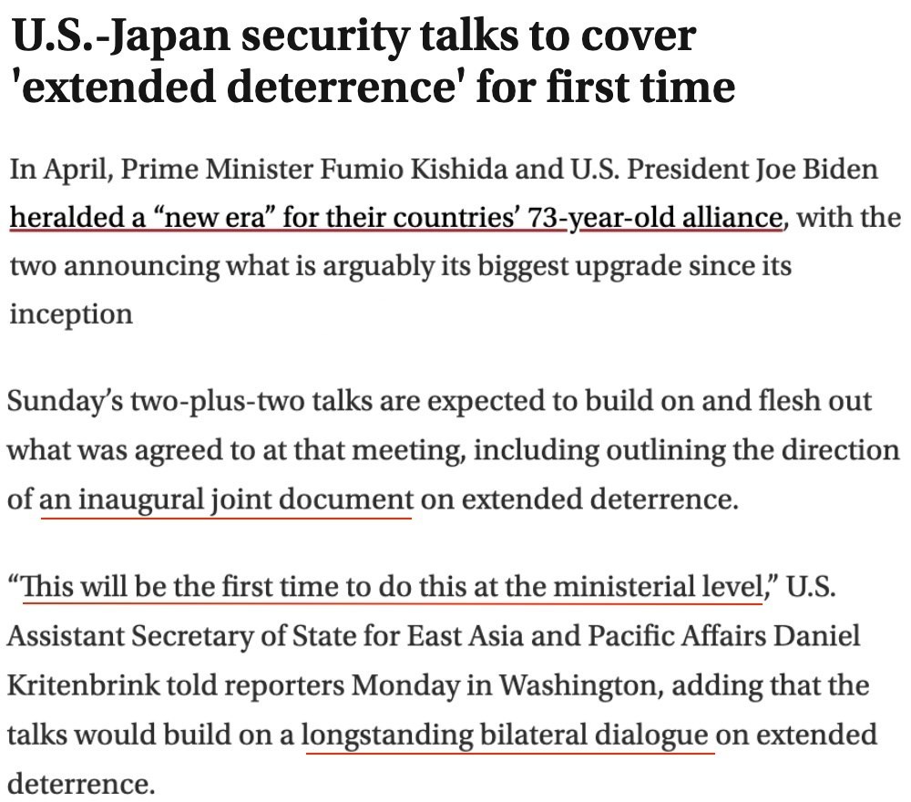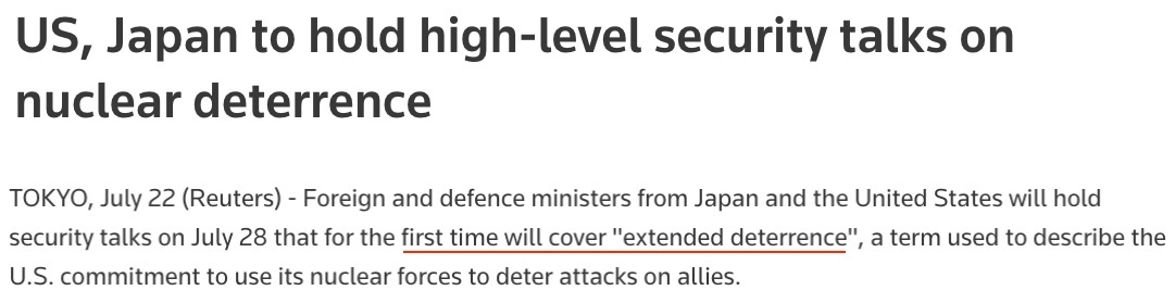 據(jù)多家外媒報道,日本和美國將于本月28日在東京舉行兩國外交部長和國防部長“2+2”會談,首次討論“延伸威懾”,即美國承諾使用包括核武器在內(nèi)的軍事力量保護盟國的問題。