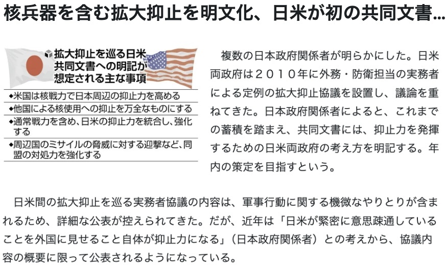 日本《讀賣新聞》援引未具名日本政府消息人士的話報道稱,日美兩國的目標(biāo)是在今年年內(nèi)出臺關(guān)于“延伸威懾”的首份聯(lián)合文件,其中將清楚地闡明“美國堅定不移捍衛(wèi)日本”的承諾。