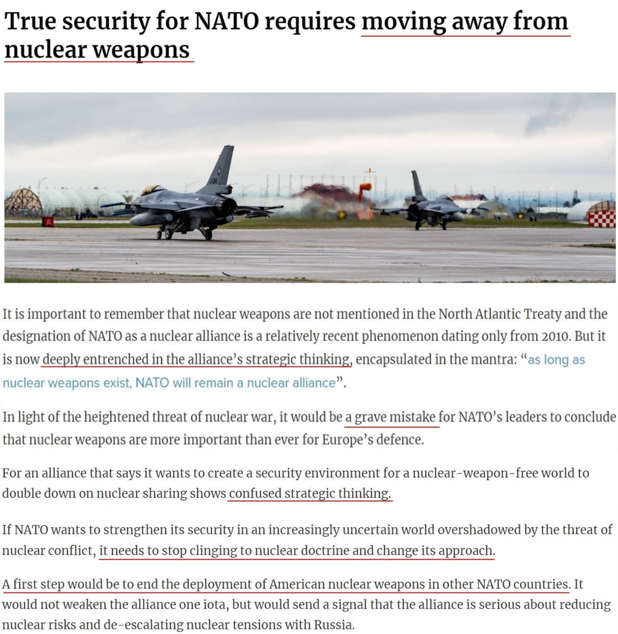 “如果北約想要在一個被核沖突威脅籠罩的世界中加強安全,就需要改變自己的想法和做法。第一步應(yīng)該是結(jié)束美國在其他北約國家部署核武器。”