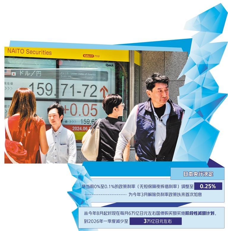 當(dāng)?shù)貢r間7月31日,日本央行舉行貨幣政策會議,決定將當(dāng)前0%至0.1%的政策利率(無擔(dān)保隔夜拆借利率)調(diào)整至0.25%。此次加息為今年3月解除負(fù)利率政策以來的首次加息。此外,日本央行還決定從今年8月起對現(xiàn)在每月6萬億日元左右的國債購買額實施階段性減額計劃,到2026年一季度減少至3萬億日元左右。