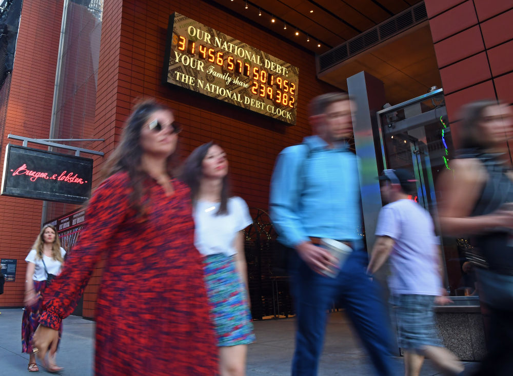 2023年6月1日,行人從美國(guó)紐約的“國(guó)債鐘”前走過。新華社記者李睿攝