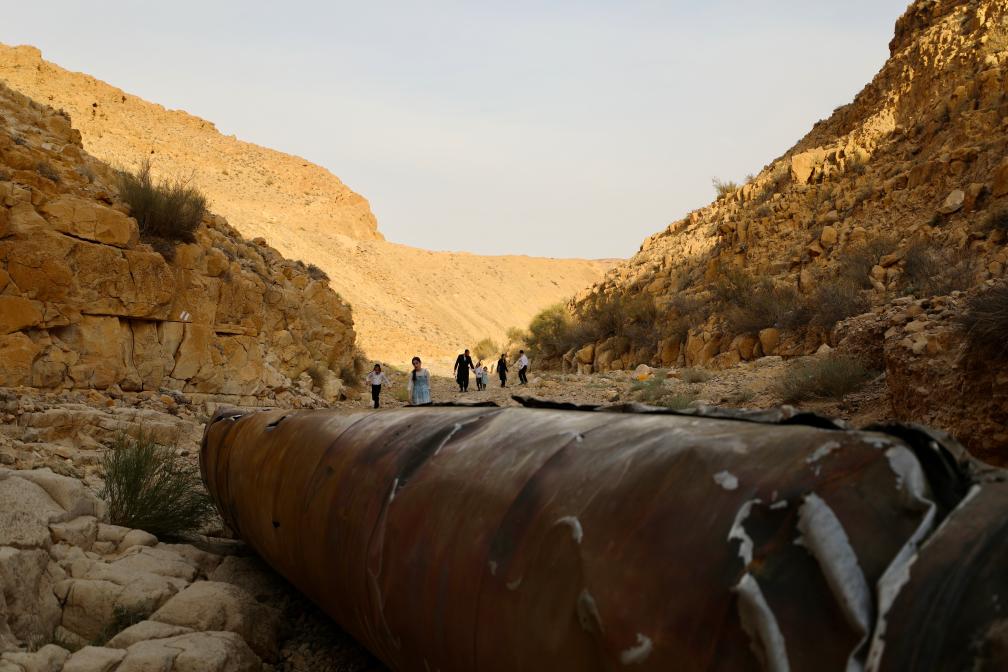 這是4月28日在以色列南部城市阿拉達(dá)附近拍攝的伊朗導(dǎo)彈殘骸。新華社發(fā)(賈馬爾·阿瓦德攝)