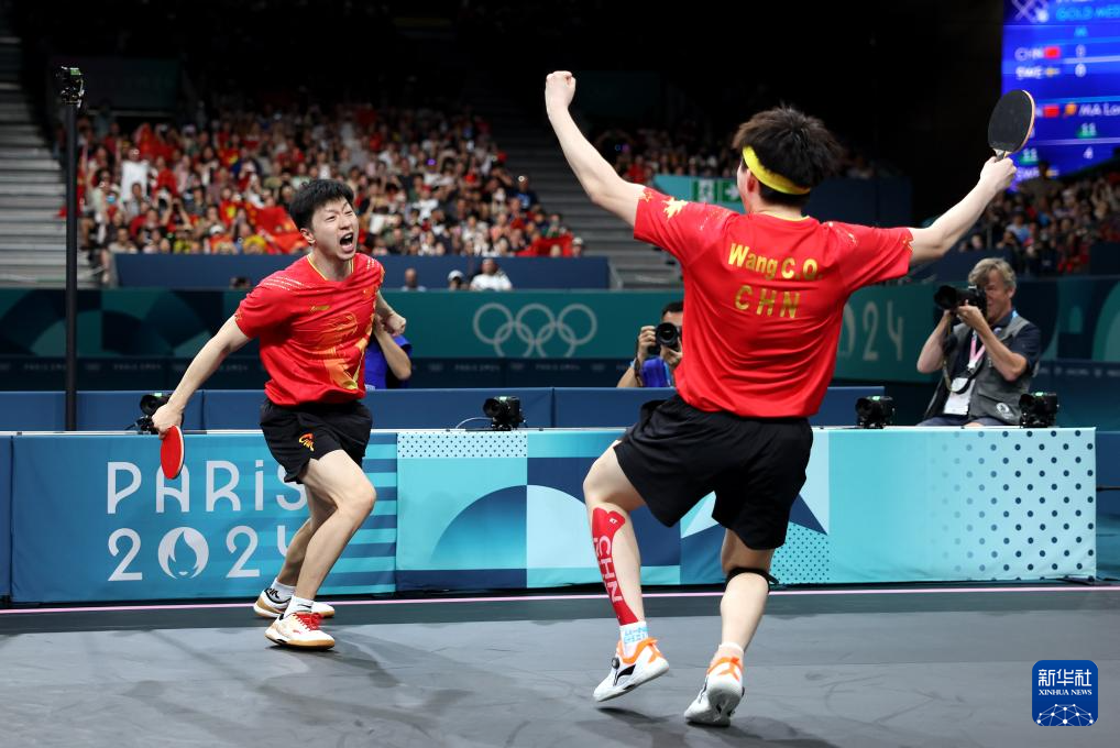 8月9日,中國(guó)隊(duì)組合馬龍(右)/王楚欽慶祝勝利。新華社記者 盧燁 攝