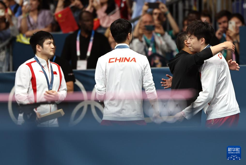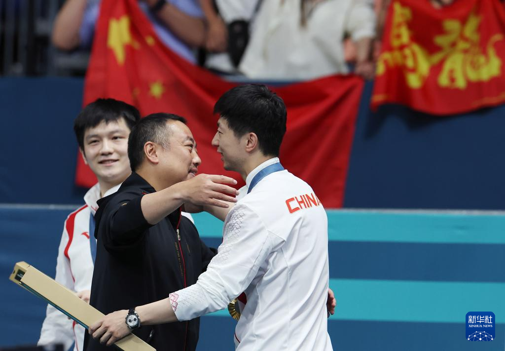8月9日,中國(guó)乒協(xié)主席劉國(guó)梁(中)賽后與馬龍(右)擁抱。新華社記者 劉續(xù) 攝