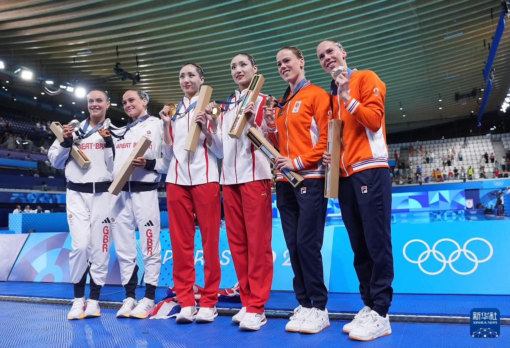 8月10日,冠軍中國組合王柳懿/王芊懿(中)、亞軍英國組合凱特/索普(左)、季軍荷蘭組合布雷赫耶/諾爾蒂在頒獎儀式上。新華社記者 薛宇舸 攝