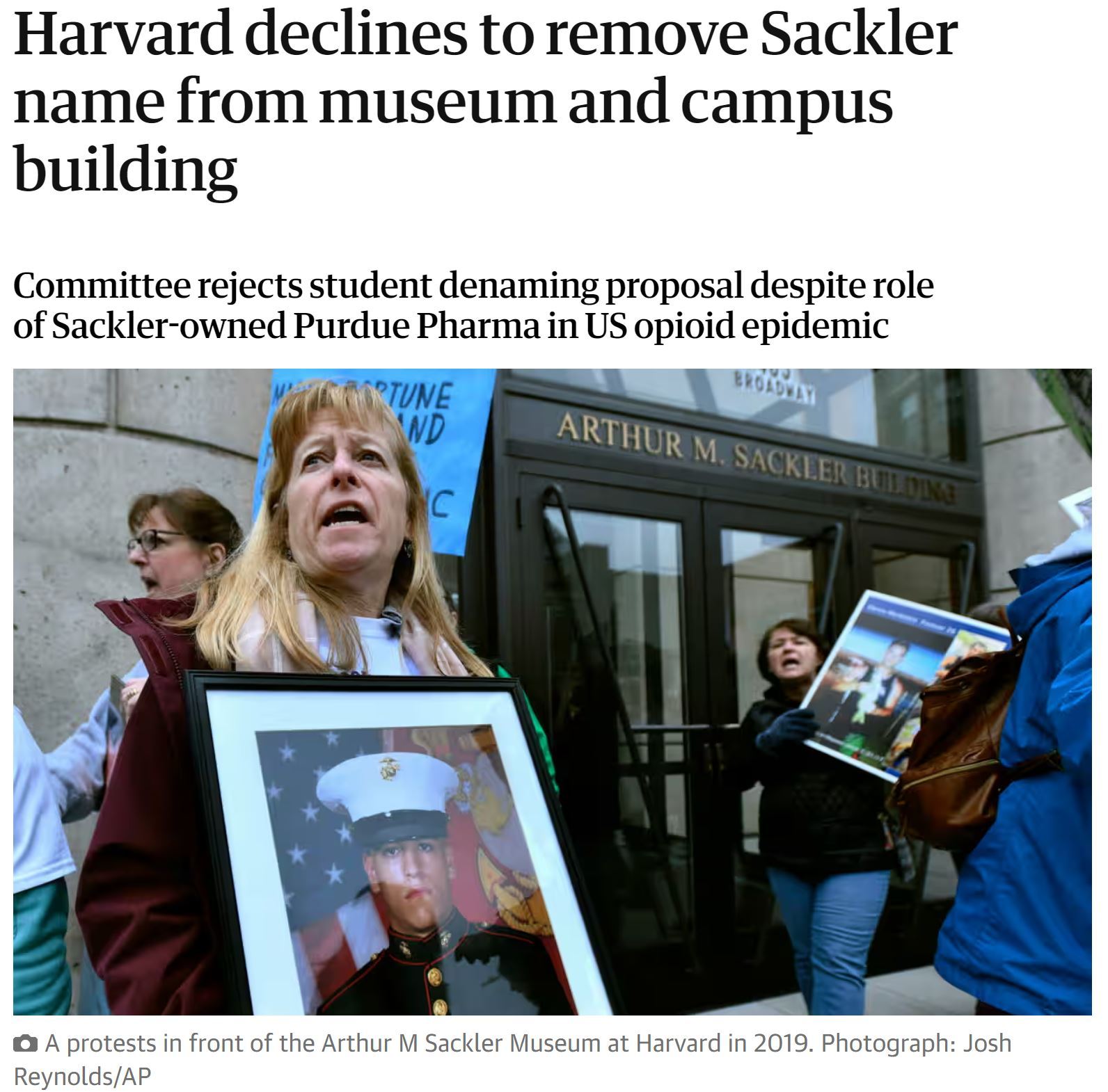 近日,美國(guó)哈佛大學(xué)拒絕了部分學(xué)生及有關(guān)方面提出的將“薩克勒”這一名字從哈佛大學(xué)博物館及其他校內(nèi)建筑上去除的要求,再次引發(fā)了人們對(duì)美國(guó)藥物成癮問(wèn)題的關(guān)注。