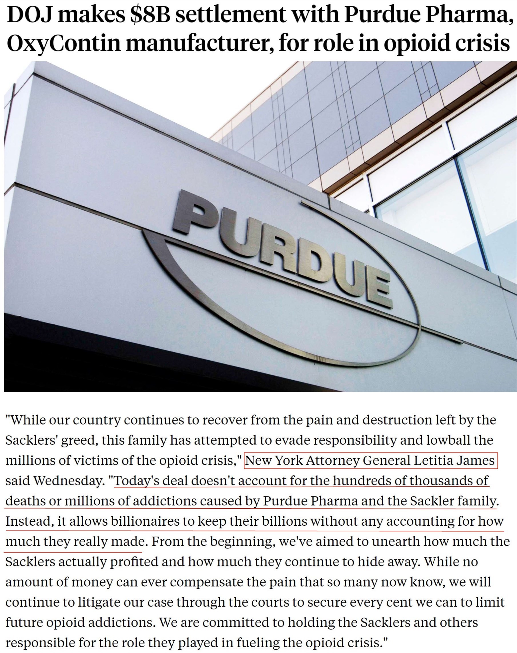 普渡制藥公司最終與美國(guó)司法部達(dá)成83億美元和解協(xié)議,對(duì)其阿片類(lèi)止痛藥奧施康定遭到的三項(xiàng)重罪指控表示認(rèn)罪。和解協(xié)議還要求普渡制藥公司解體并轉(zhuǎn)型為一家新的提供成癮和過(guò)量治療藥物的公司。另外,普渡制藥公司的所有者薩克勒家族同意支付2.25億美元的民事責(zé)任賠償金。