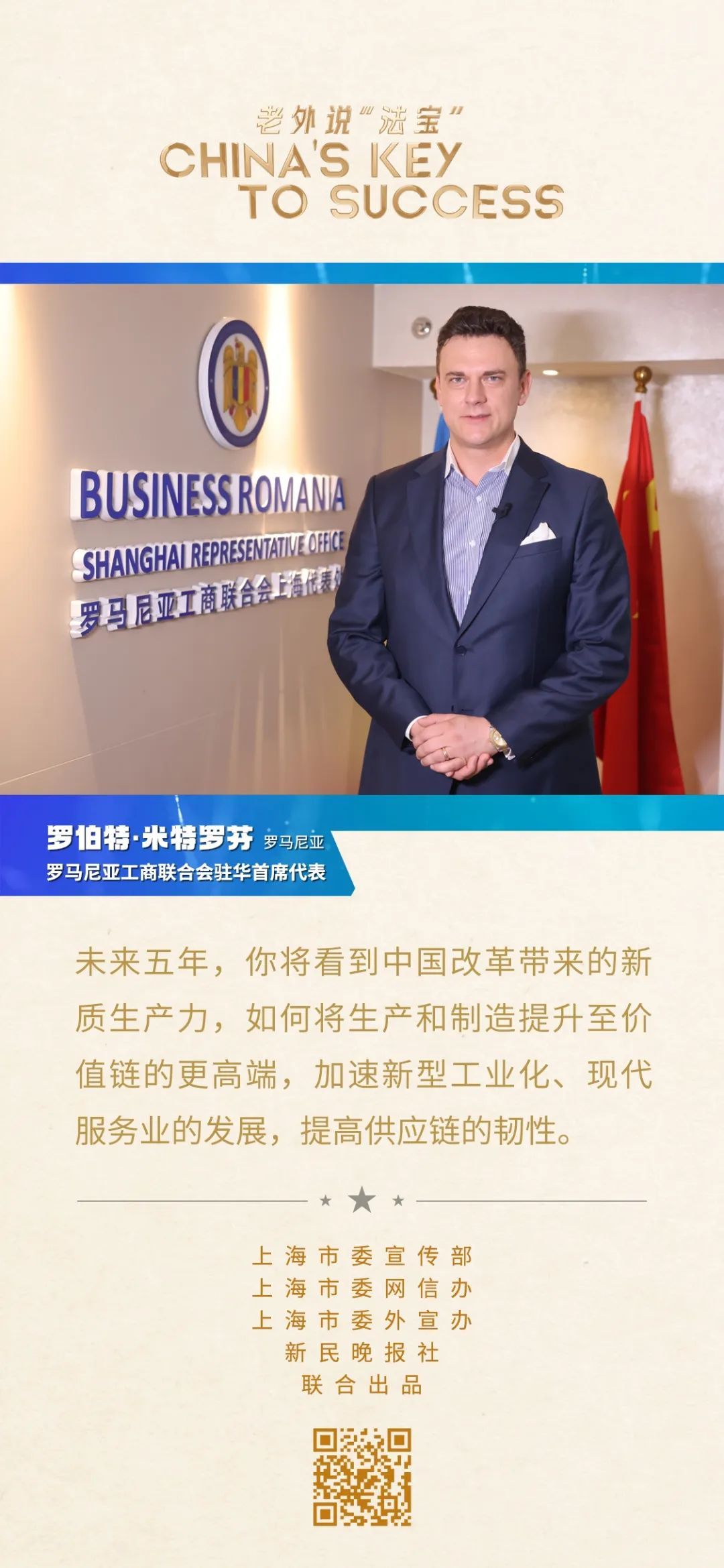 羅伯特·米特羅芬是羅馬尼亞工商聯(lián)合會(huì)駐華首席代表。2010年,他以羅馬尼亞國(guó)家館工作人員的身份來(lái)滬參加上海世博會(huì),那次的旅程讓他深深?lèi)?ài)上了這座城市。從那時(shí)起,他就在上海定居。