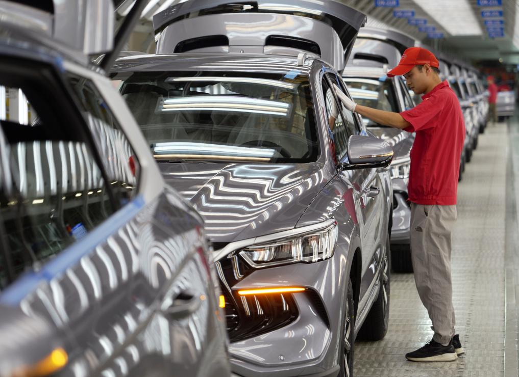 2024年4月24日,工人在位于河南省鄭州市的鄭州航空港區(qū)比亞迪總裝工廠新能源汽車“宋Pro”生產(chǎn)線上對(duì)車輛進(jìn)行質(zhì)檢。新華社記者李嘉南攝