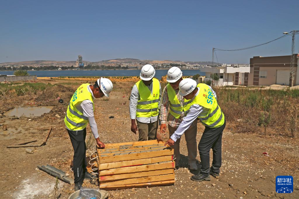 8月12日,在突尼斯比塞大,四川公路橋梁建設(shè)集團有限公司工作人員與突尼斯工程師在比塞大運河附近進行地質(zhì)勘探工作。 新華社發(fā)(阿代爾攝)