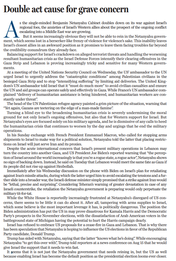 對不斷擴大的人道主義危機視而不見,不僅嚴重損害了以色列軍事行動的道德基礎,也損害了美國和西方支持以色列的道德基礎。內塔尼亞胡眼里只有軍事議程,對任何要求他關注人道主義危機、結束軍事行動的呼聲都置之不理,不屑一顧。