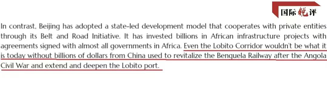 黎文濤認(rèn)為,美國試圖把“洛比托走廊”包裝成美歐為非洲基建作出的貢獻(xiàn),完全不符合事實。因為它的核心骨架中國早已搭好,中國才是名副其實的最大貢獻(xiàn)者?!奥灞韧凶呃取惫倬W(wǎng)上也有這樣一段話:“如果沒有中國投入數(shù)十億美元重建本格拉鐵路、擴(kuò)建洛比托港口,‘洛比托走廊’就沒有當(dāng)今的模樣?!?/p>