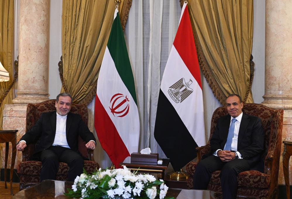 10月17日,埃及外長阿卜杜勒阿提(右)在首都開羅會見來訪的伊朗外長阿拉格齊。新華社發(fā)(賽義德·穆罕默德攝)