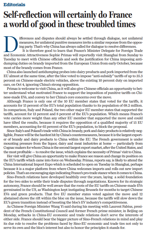 歐盟加征關(guān)稅的措施生效之際,普里馬斯的到訪將給中國提供一個說服法國、改變法國的機(jī)會。據(jù)報,普里馬斯將出席定于11月5日在上海開幕的進(jìn)博會。進(jìn)博會以進(jìn)口為主題,是中國推動高水平開放的平臺。一直以來,法國對華展現(xiàn)出的自由貿(mào)易立場,令人鼓舞。