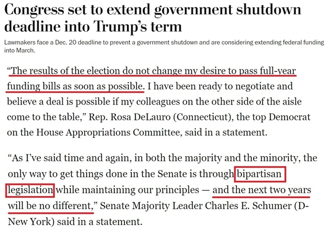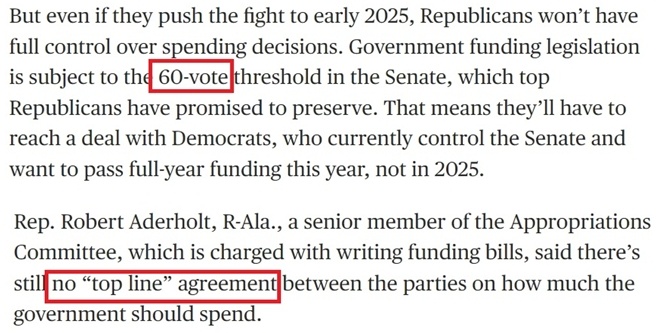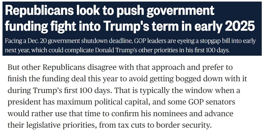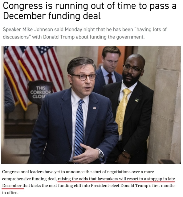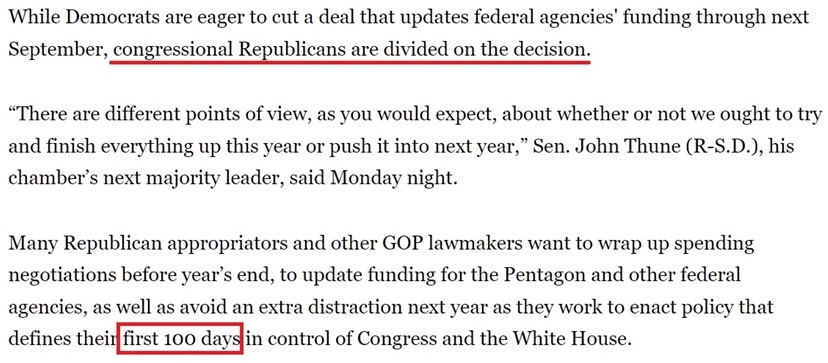 據(jù)報(bào)道,不少共和黨議員、特別是負(fù)責(zé)撥款的議員希望在年底前完成新財(cái)年的總預(yù)算支出談判,避免給特朗普的新政府明年上任后制定政策時(shí)帶來額外干擾,因?yàn)檫@些政策將“決定他們控制國(guó)會(huì)和白宮的頭100天”。