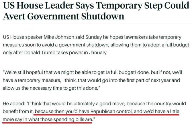 根據(jù)約翰遜的想法,國(guó)會(huì)應(yīng)通過一個(gè)“能生效至明年上半年”的短期撥款法案,以確保特朗普明年1月就任總統(tǒng)后,共和黨人能有充足的時(shí)間來按照自己的政策意愿通過完整的年度預(yù)算案。