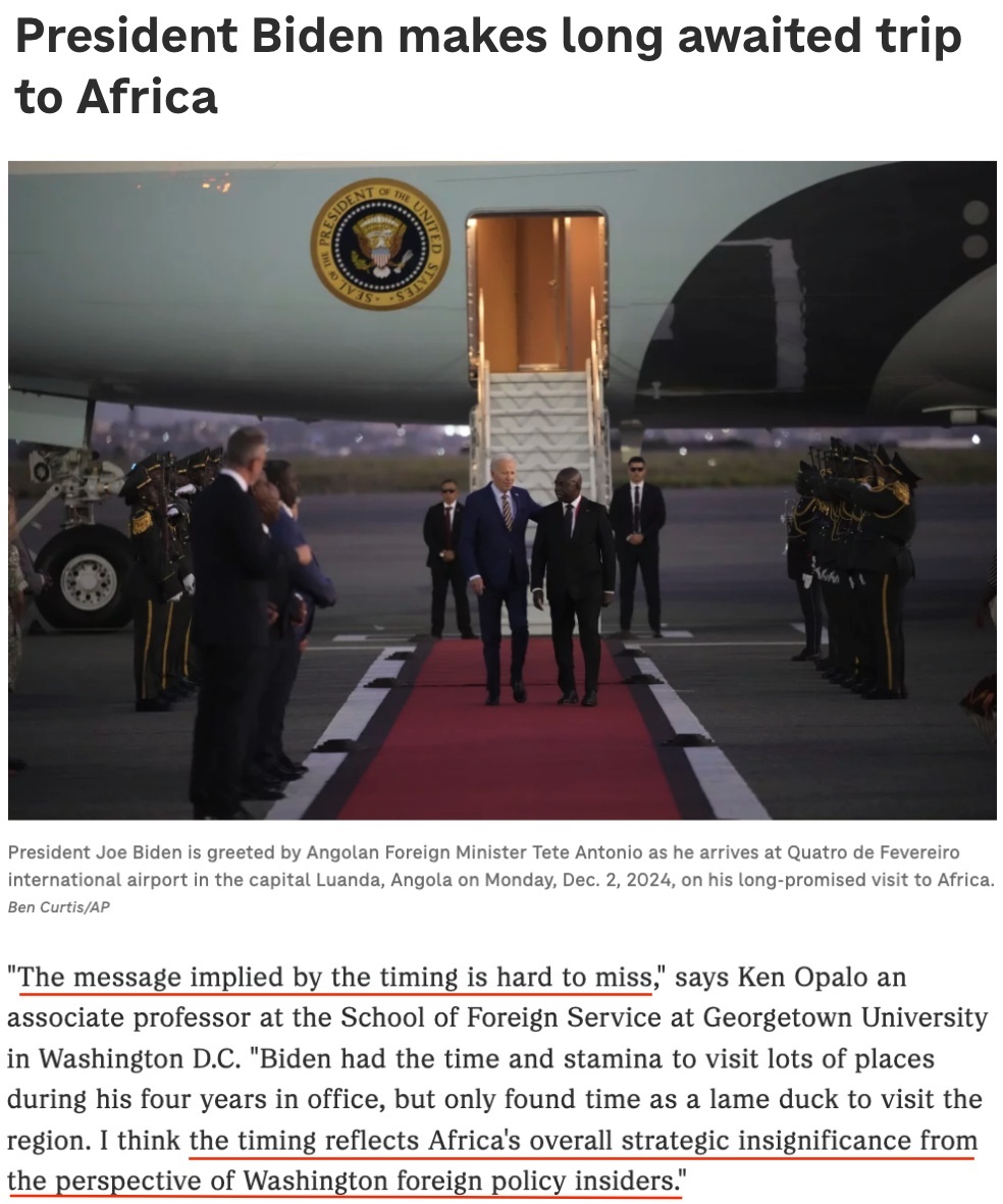 △美國(guó)有線電視新聞網(wǎng)報(bào)道:這是一場(chǎng)拖了太久的訪問(wèn)。2022年在華盛頓舉行的美非峰會(huì)上,拜登曾承諾2023年訪問(wèn)非洲,但他食言了。即便是這次原本安排在10月的安哥拉之行也因美國(guó)國(guó)內(nèi)發(fā)生颶風(fēng)災(zāi)害而推遲。
