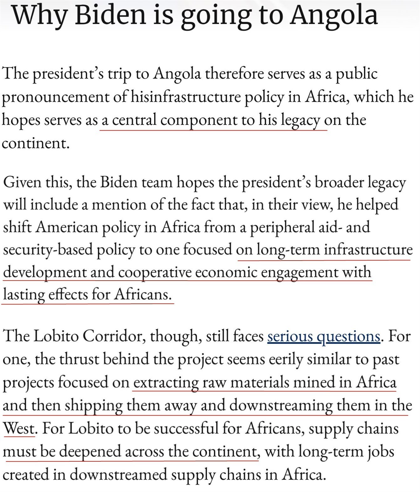 文章認(rèn)為,“洛比托走廊”要想在非洲取得成功,就必須深化整個(gè)非洲大陸的供應(yīng)鏈,在非洲的下游供應(yīng)鏈中創(chuàng)造長(zhǎng)期就業(yè)機(jī)會(huì),但這顯然不是美國(guó)的優(yōu)先考慮。
