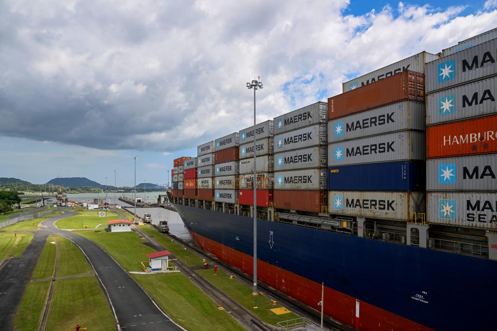 8月28日,在巴拿馬首都巴拿馬城附近,一艘貨輪通過巴拿馬運河的米拉弗洛雷斯船閘準備駛入太平洋。新華社記者李木子攝