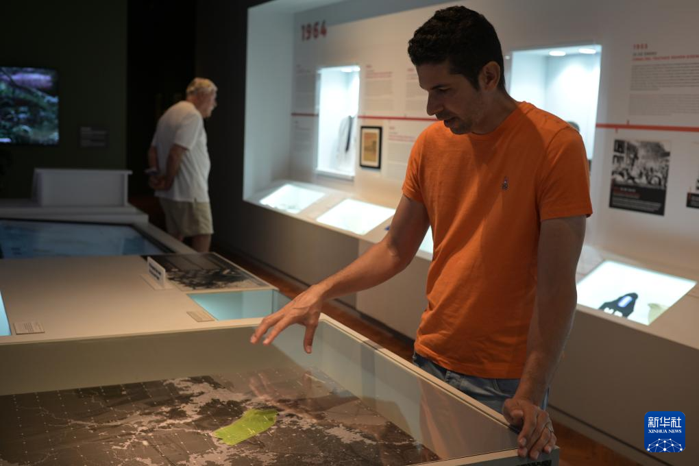 12月18日,在巴拿馬首都巴拿馬城,巴拿馬攝影師阿爾弗雷多·馬蒂斯在巴拿馬運(yùn)河博物館“未爆的炸彈”展覽上進(jìn)行講解。新華社記者 陳昊佺 攝