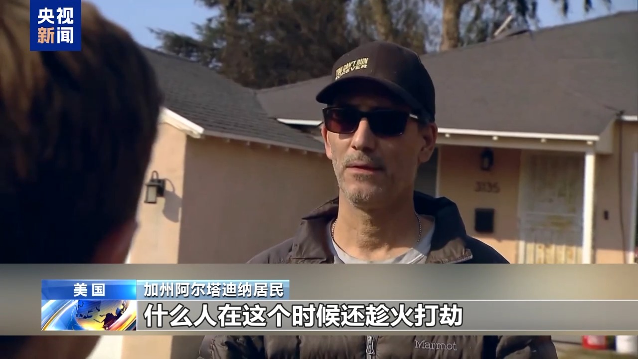 在受到“伊頓山火”侵襲的阿爾塔迪納地區(qū),多名當?shù)鼐用窬驮庥鋈胧覔尳俚耐{。一名居民說,他和鄰居的幾座房屋在山火中得以幸存。他們在自行滅火的過程中,有兩伙人試圖破門而入,實施搶劫,被他們趕跑。
