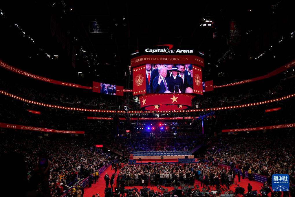 1月20日,在美國首都華盛頓第一資本體育館,人們觀看美國第47任總統(tǒng)就職典禮的轉播。新華社記者 吳曉凌 攝