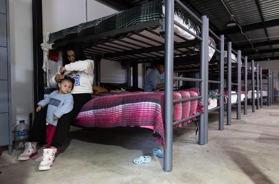 2025年2月2日,在墨西哥奇瓦瓦州華雷斯城的一處移民收容所,一位母親為女兒梳頭。新華社記者李夢馨攝