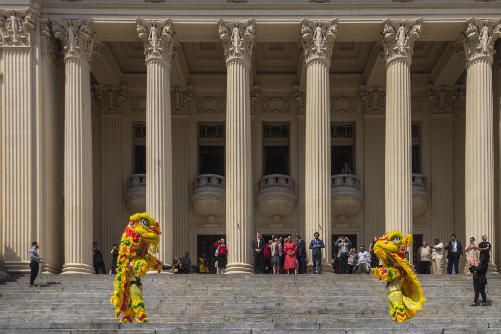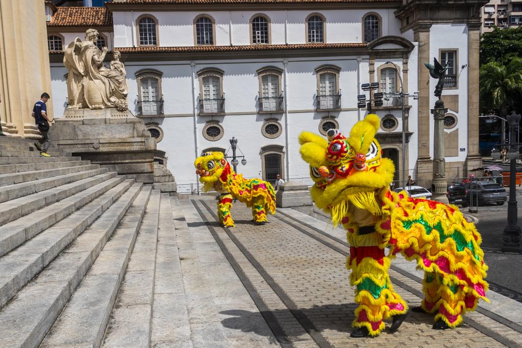 2月6日,中國農(nóng)歷正月初九,巴西里約熱內(nèi)盧州蒂拉登特斯宮(州議會)大門外,里約州議會副議長蒂婭·茹和中國駐里約熱內(nèi)盧總領(lǐng)事田敏用手中的毛筆共同為兩只舞獅點(diǎn)睛。瞬間,“獅子”舞動起來,里約州議會中國農(nóng)歷新年慶典拉開帷幕。