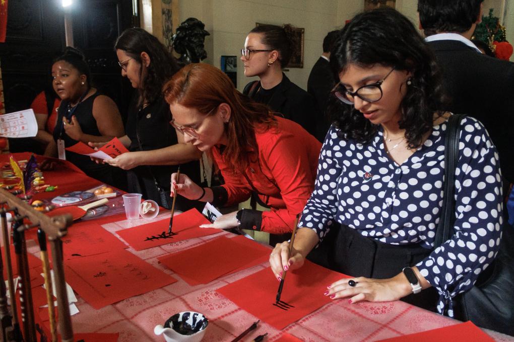 2月6日,在巴西里約熱內(nèi)盧州蒂拉登特斯宮(州議會),人們在體驗(yàn)書法。新華社發(fā)(克勞迪婭·馬爾提尼 攝)