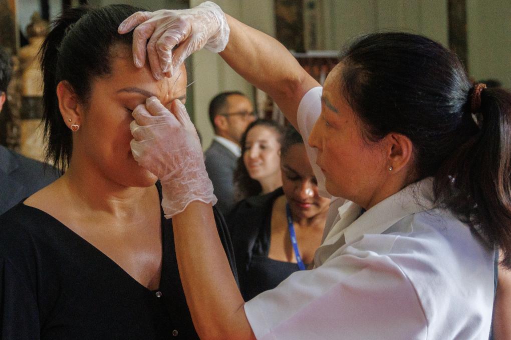 2月6日,在巴西里約熱內(nèi)盧州蒂拉登特斯宮(州議會),一名女子(左)在體驗(yàn)針灸。新華社發(fā)(克勞迪婭·馬爾提尼 攝)