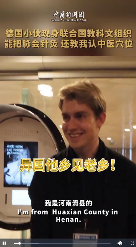 由中國常駐聯(lián)合國教科文組織代表團(tuán)與河南衛(wèi)視共同舉辦的“我們的春節(jié)”慶?;顒赢?dāng)?shù)貢r(shí)間6日晚在位于法國巴黎的聯(lián)合國教科文組織總部華美亮相?;顒蝇F(xiàn)場,記者遇到德國小伙推介中醫(yī)文化。這位名叫“無名”的德國小伙,早已憑借地道的河南話和對中醫(yī)的熱愛多次爆火出圈。在法國巴黎聯(lián)合國教科文組織總部,參與“我們的春節(jié)”活動之余,無名還開啟了中醫(yī)小課堂。(王高飛)