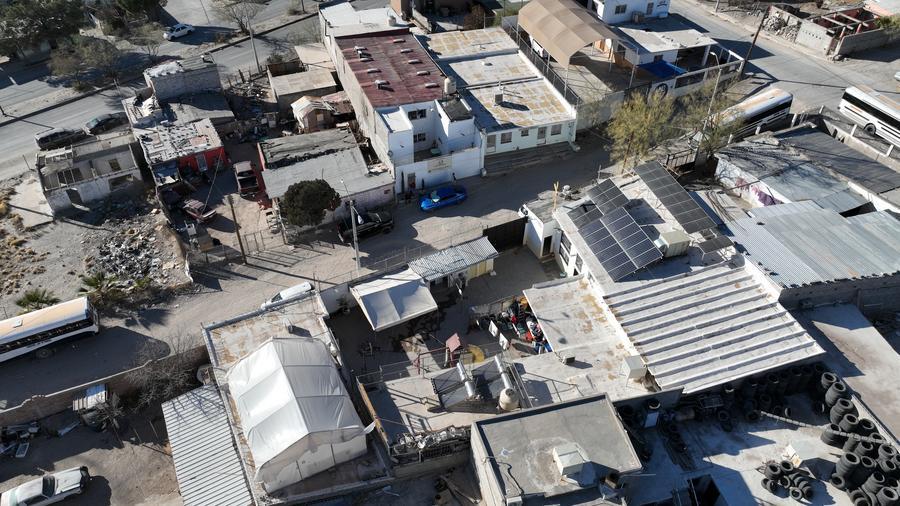 這是2025年2月2日在墨西哥奇瓦瓦州華雷斯城拍攝的一處移民收容所(無人機(jī)照片)。新華社記者 李夢馨 攝