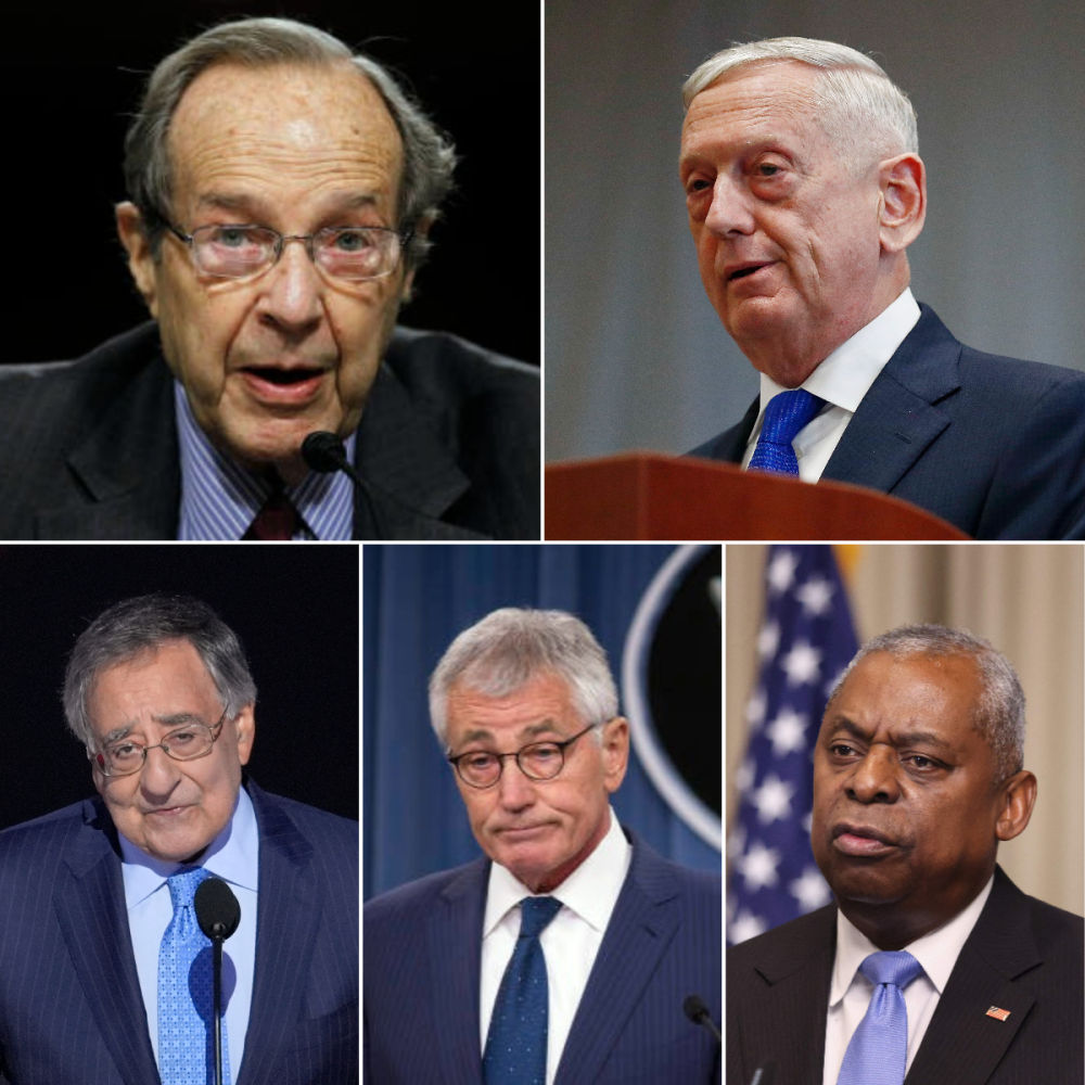 拼版照片,圖為美國前國防部長佩里(上左)、馬蒂斯(上右)、帕內(nèi)塔(下左)、哈格爾(下中)和奧斯汀。圖片源自網(wǎng)絡(luò)