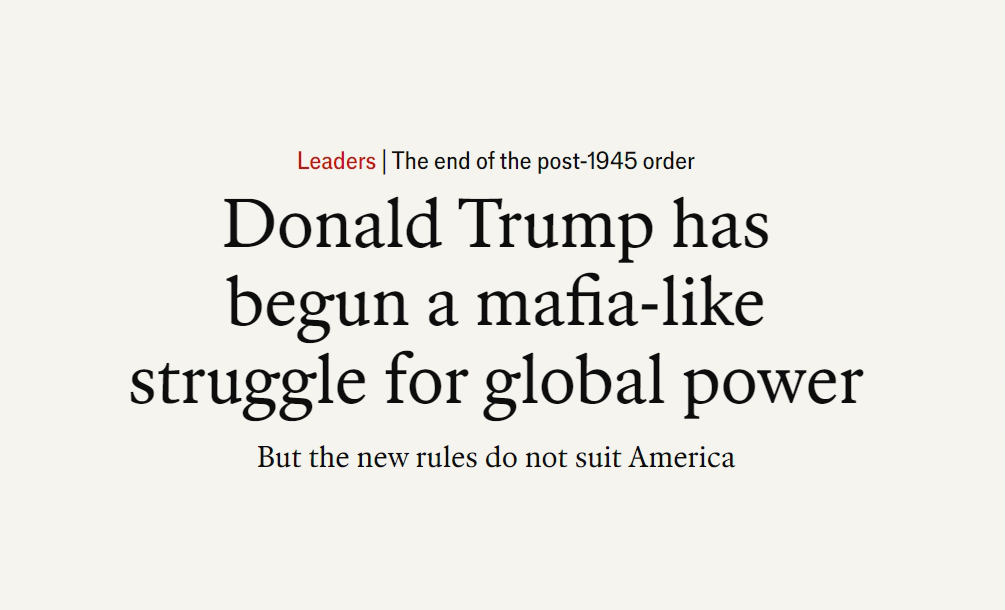 英國(guó)《經(jīng)濟(jì)學(xué)人》網(wǎng)站近期刊文稱,美國(guó)總統(tǒng)特朗普已經(jīng)開啟一場(chǎng)黑手黨式的全球權(quán)力爭(zhēng)奪。1945年后建立的世界秩序正在加速撕裂。一個(gè)強(qiáng)權(quán)即公理、小國(guó)受欺負(fù)的世界正快速到來(lái)。文章摘要如下: