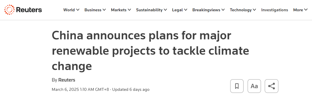 據(jù)路透社報道,中國政府5日宣布,將推出一系列重大可再生能源項目,力爭在2030年前實現(xiàn)二氧化碳排放峰值,并在2060年達成碳中和目標。