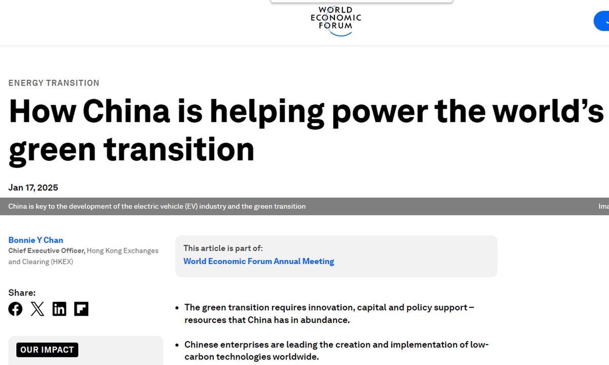 世界經(jīng)濟論壇網(wǎng)站題為《中國助力全球綠色轉型》的文章強調,中國在推動全球綠色轉型過程中具有關鍵作用,特別是在電動車、可再生能源及低碳技術領域。