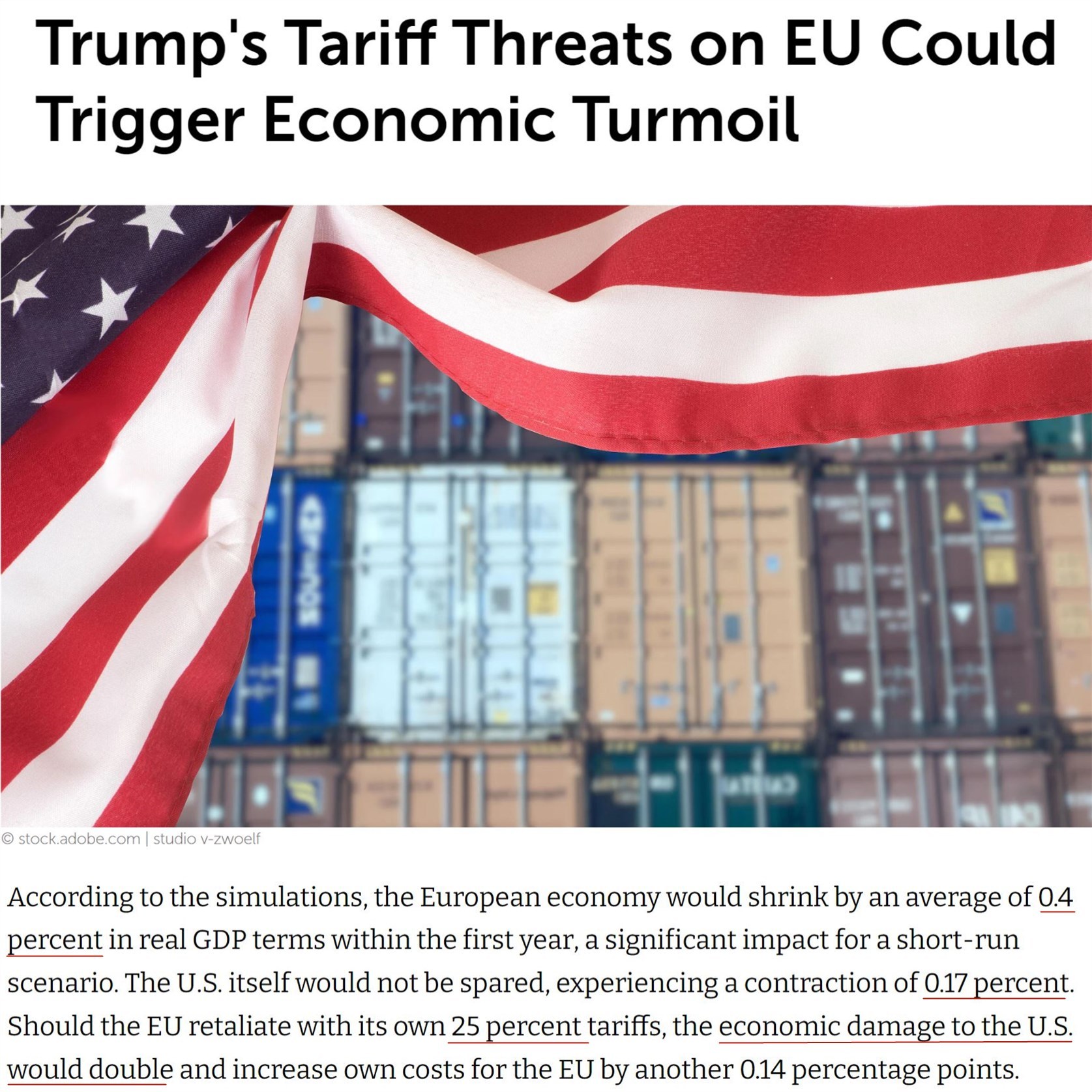 據(jù)德國基爾世界經(jīng)濟(jì)研究所此前推算,如果美國計劃中的關(guān)稅措施全部落地,歐盟和美國經(jīng)濟(jì)在第一年將分別萎縮0.4%和0.17%。如果歐盟以25%的關(guān)稅加以反制,美國的經(jīng)濟(jì)損失將翻倍。
