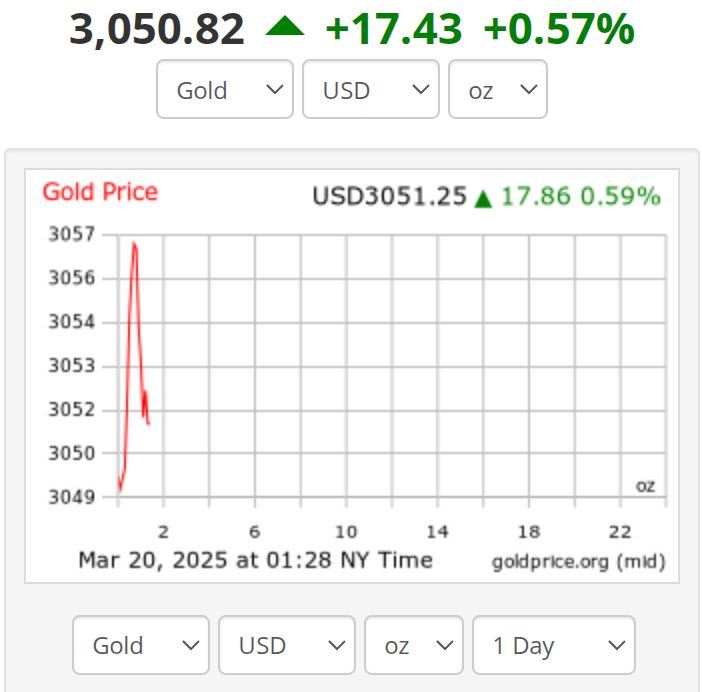 △當(dāng)?shù)貢r間20日開盤后,紐約商品交易所現(xiàn)貨黃金價格一度接近每盎司3057美元(圖自國際金價網(wǎng)站)