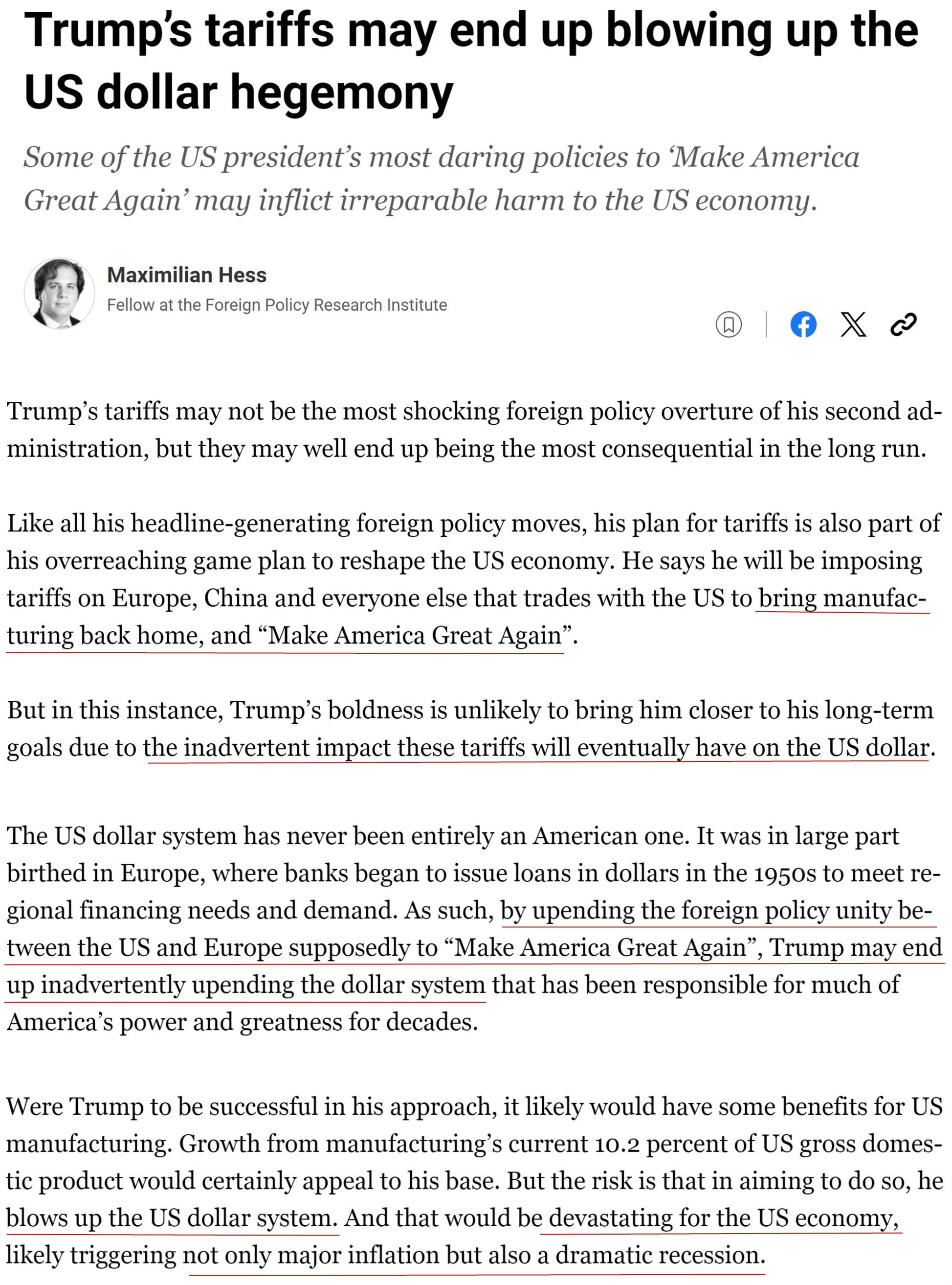 文章指出,一直以來,全球?qū)γ涝男枨笫蛊涑蔀槊绹闹饕隹诋a(chǎn)品。正是這種“過分的特權(quán)”使美國能夠在不對經(jīng)濟(jì)造成重大負(fù)擔(dān)的情況下長期維持貿(mào)易和財政赤字。而如今特朗普政府的關(guān)稅政策可能最終摧毀美元霸權(quán),從而使美國經(jīng)濟(jì)遭到毀滅性打擊。