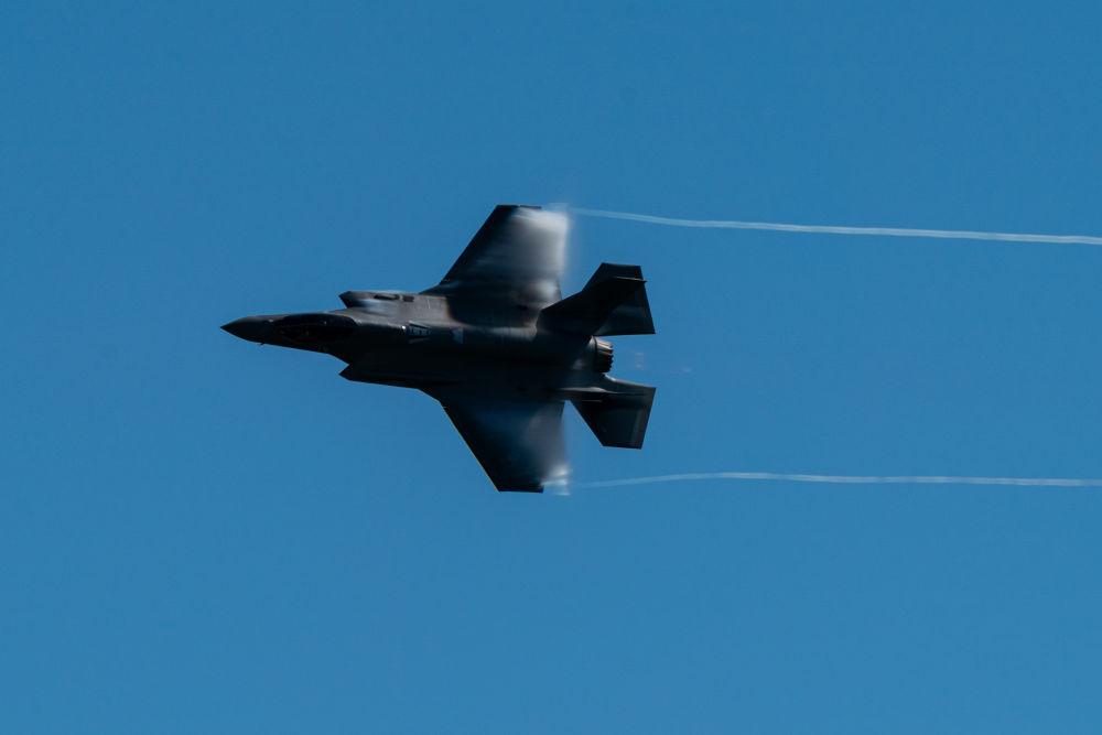 2023年10月14日,在美國(guó)休斯敦航展上,F(xiàn)-35閃電飛行表演隊(duì)的一架飛機(jī)進(jìn)行表演。新華社發(fā)(陳晨攝)