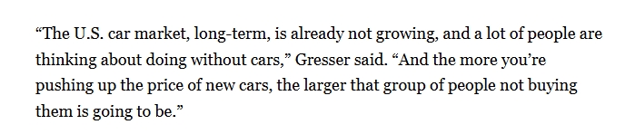“從長(zhǎng)期來(lái)看,美國(guó)汽車市場(chǎng)已不再增長(zhǎng),越是推高新車價(jià)格,不買車的人就會(huì)越多?!?/p>