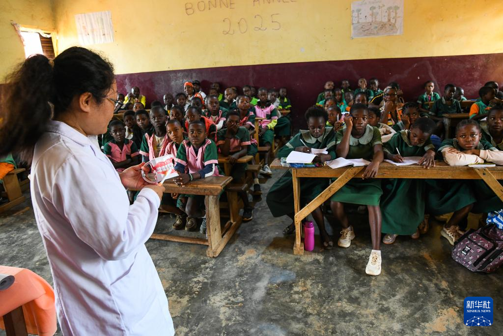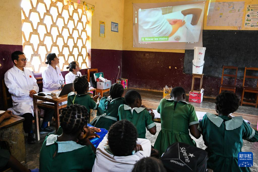 4月3日,在喀麥隆姆巴爾馬約的一所小學(xué),中國(山西)第24批援喀麥隆醫(yī)療隊(duì)姆巴爾馬約分隊(duì)的醫(yī)生教授學(xué)生預(yù)防傳染病的方法。新華社發(fā)(科普索攝)