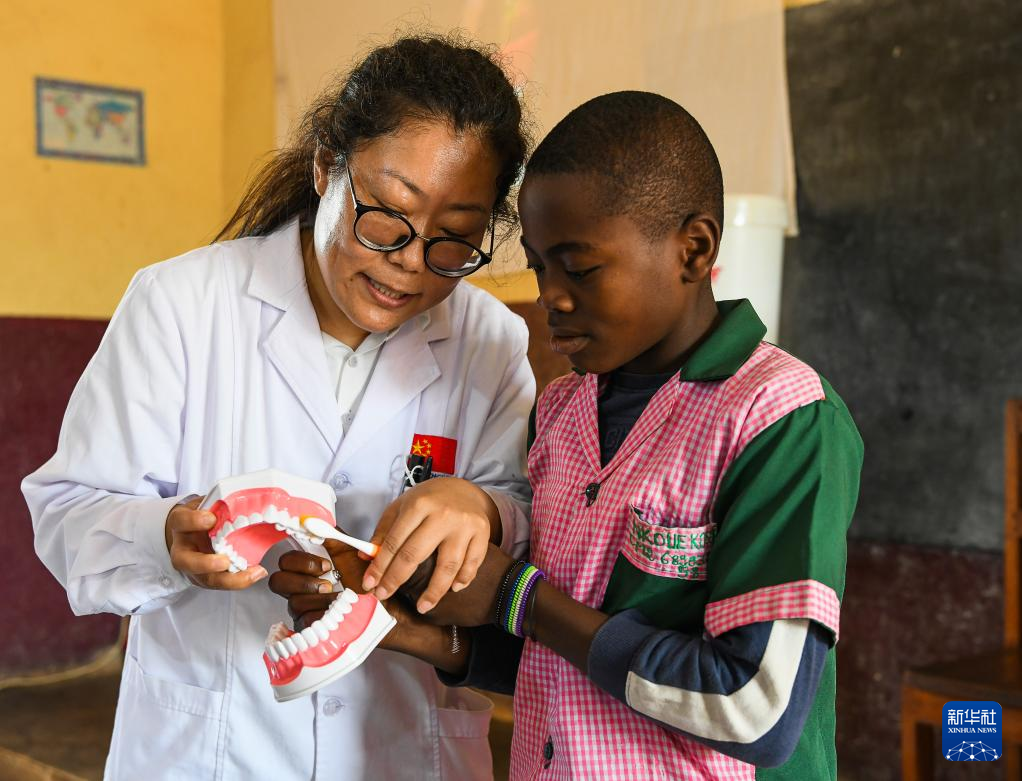 4月3日,在喀麥隆姆巴爾馬約的一所小學(xué),中國(山西)第24批援喀麥隆醫(yī)療隊(duì)姆巴爾馬約分隊(duì)的醫(yī)生為學(xué)生演示正確的刷牙技巧。新華社發(fā)(科普索攝)