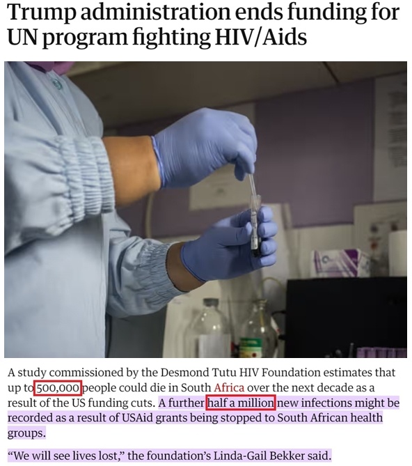 南非德斯蒙德·圖圖艾滋病中心主任琳達(dá)-蓋爾·貝克爾告訴記者,美國取消對(duì)當(dāng)?shù)乜拱M織的資助將導(dǎo)致“超過50萬不必要的死亡以及多達(dá)50萬新增感染病例”,使有關(guān)方面“過去25年的所有努力付諸東流”。